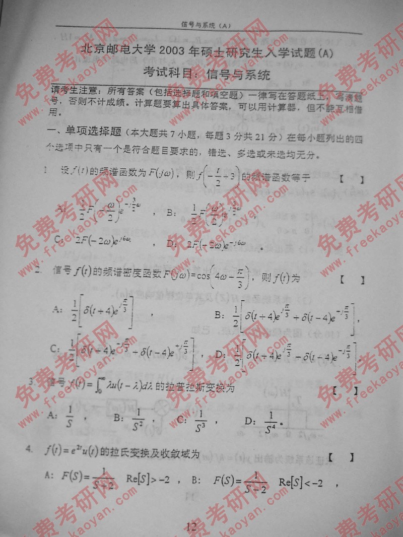 北京邮电大学2003年半岛在线注册真题-信号与系统A