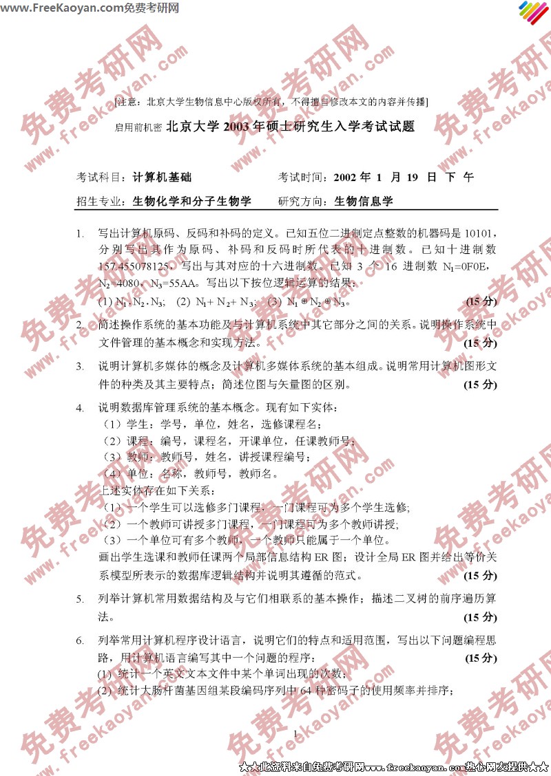 北京大学2003年半岛在线注册真题-生物学专业计算机基础