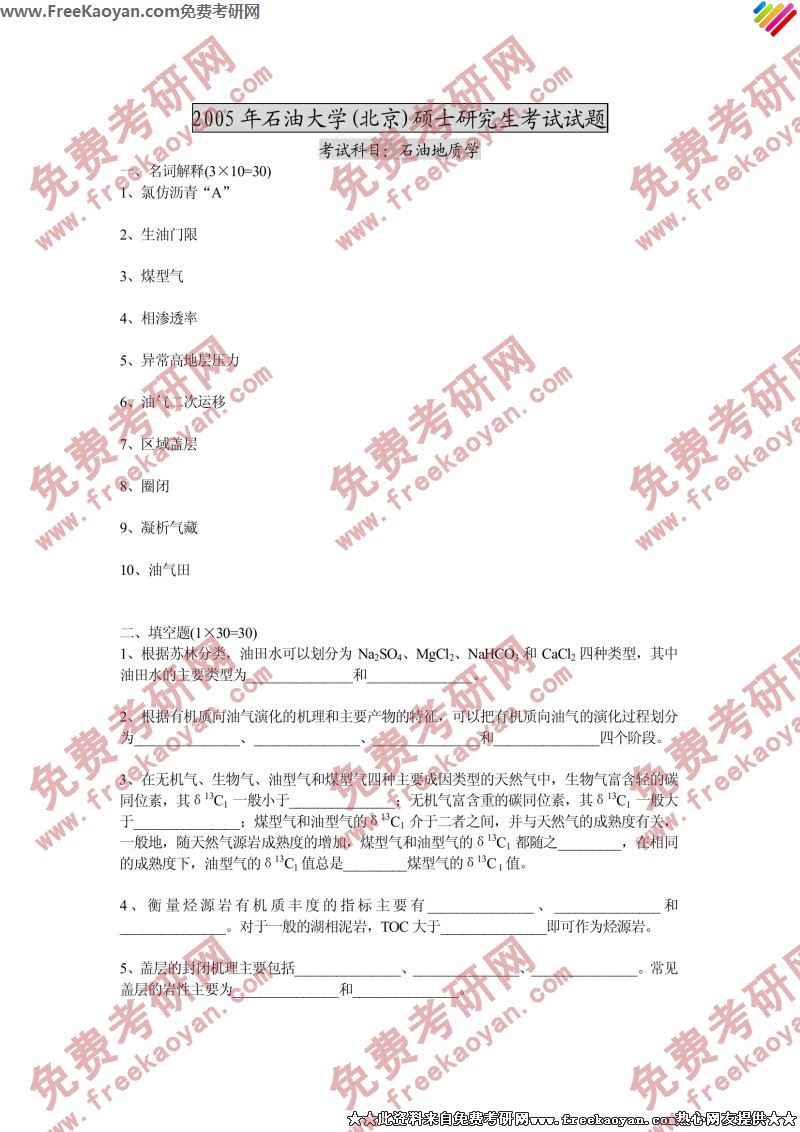 中国石油大学(北京)2005年半岛在线注册真题-石油地质学