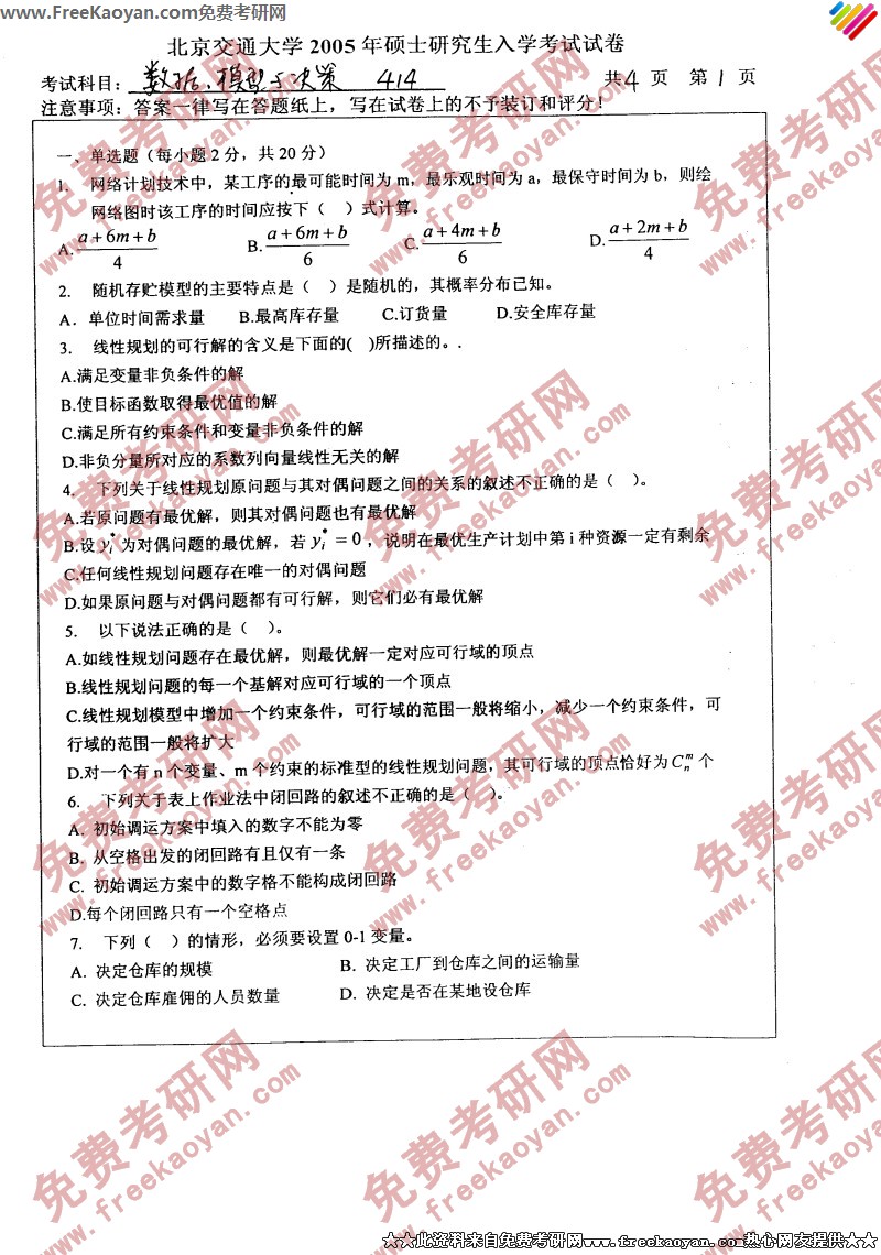 北京交通大学2005年半岛在线注册真题-物流管理与工程数据模型与决策