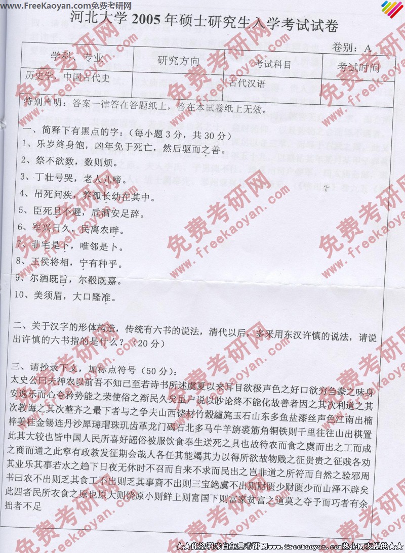 河北大学2005年半岛在线注册真题-古代汉语