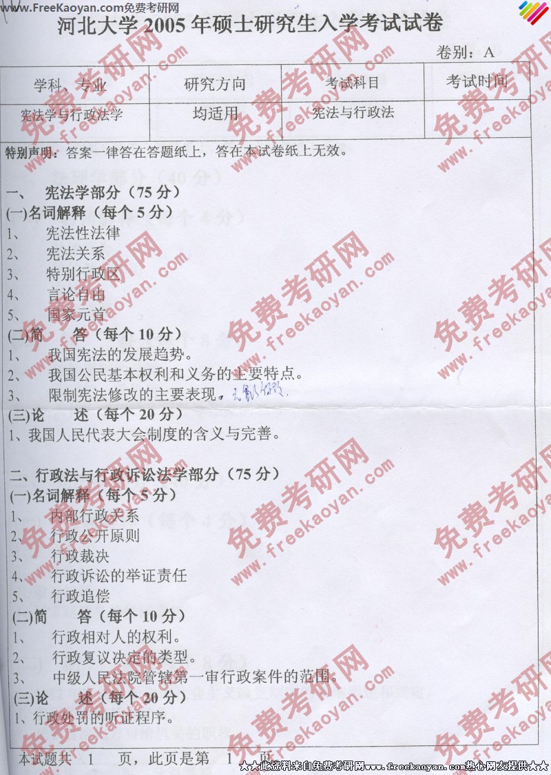 河北大学2005年半岛在线注册真题-宪法与行政法