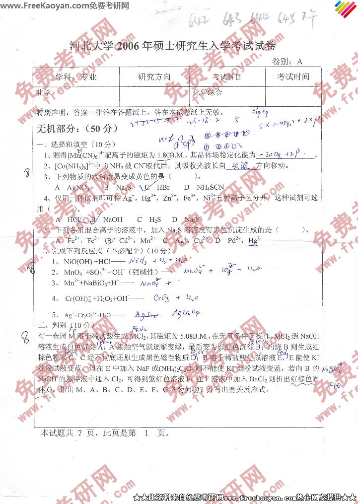 河北大学2006年半岛在线注册真题-化学综合