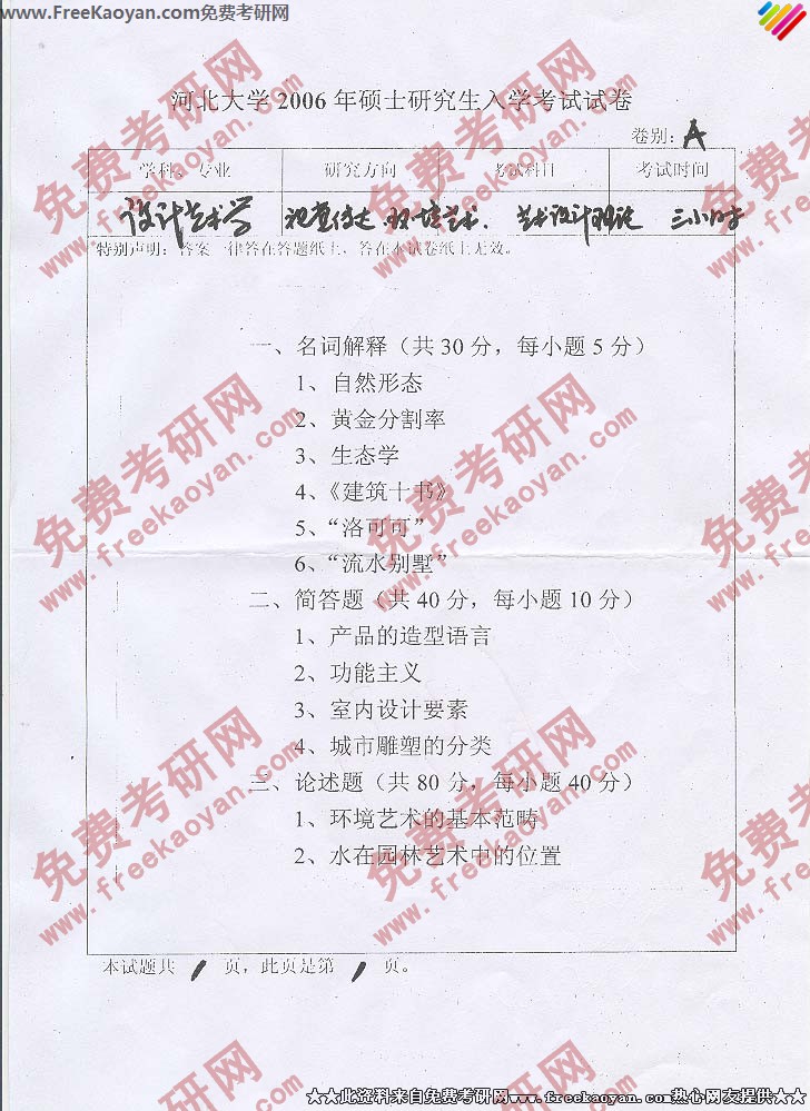 河北大学2006年半岛在线注册真题-艺术设计理论