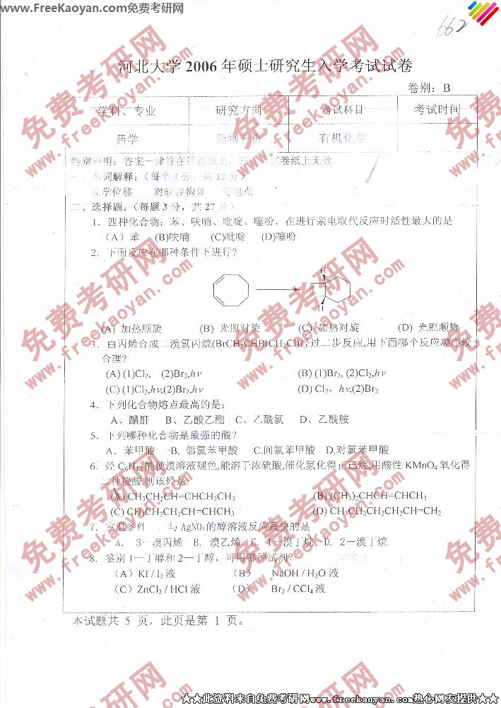 专业课半岛在线注册经验 本站小编 FreeKaoyan 2018-01-23河北大学2006年半岛在线注册真题-有机化学
