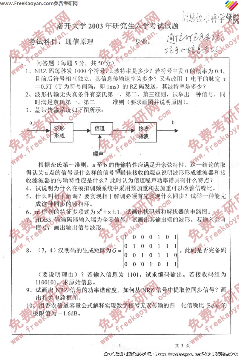 南开大学2003年半岛在线注册真题-通信原理