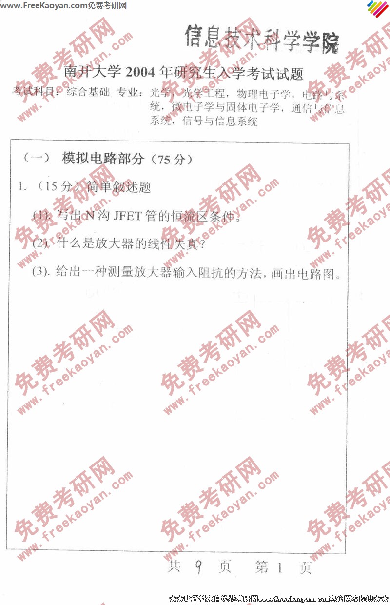 南开大学2004年半岛在线注册真题-信息技术科学学院综合基础课