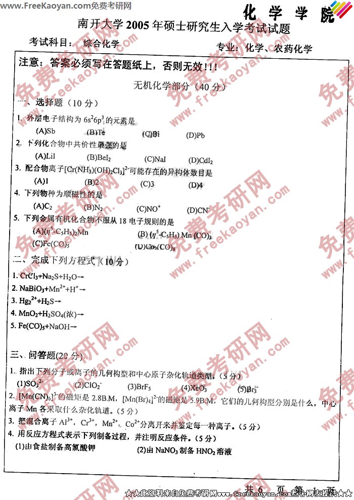 南开大学2005年半岛在线注册真题-综合化学