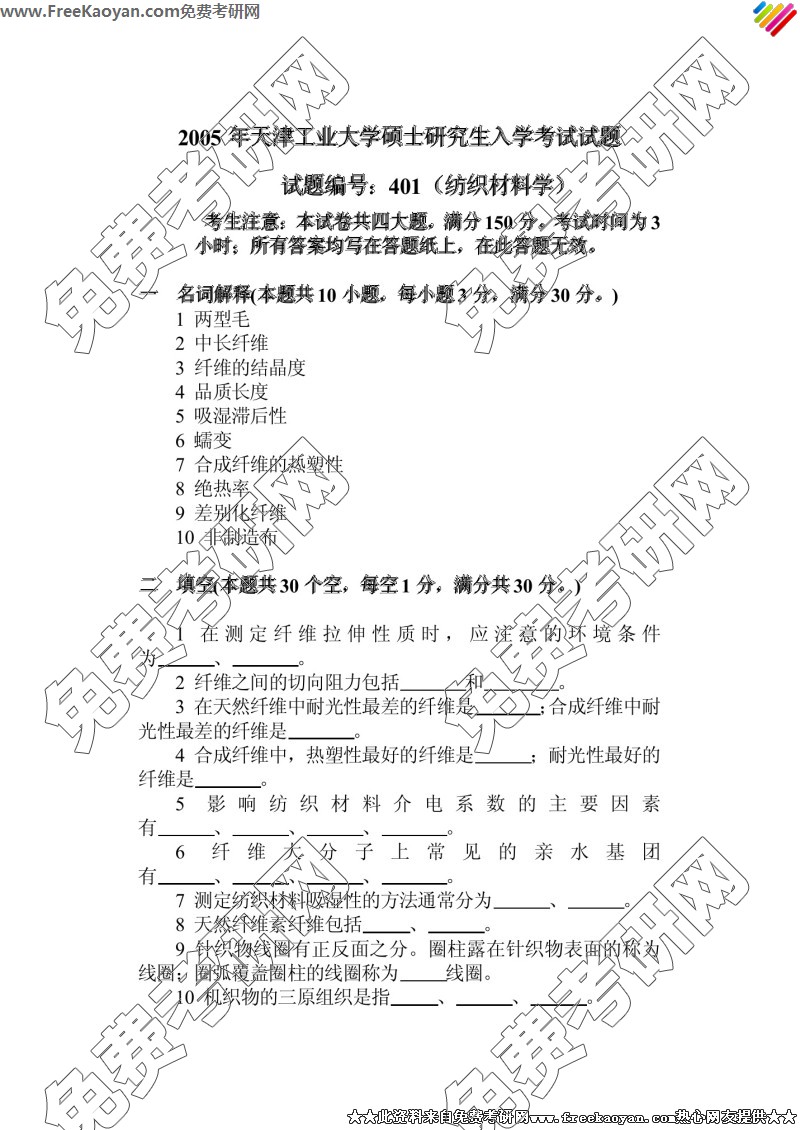 天津工业大学2005年半岛在线注册真题-纺织材料学