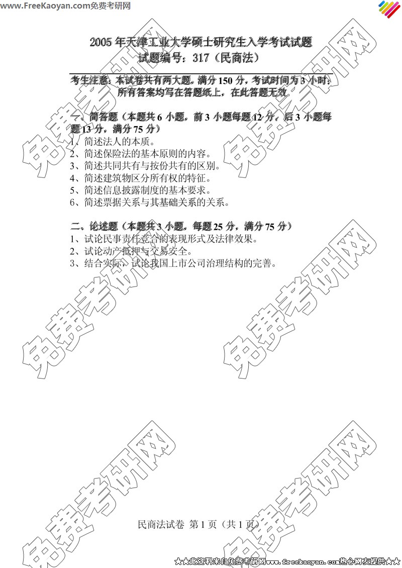 专业课半岛在线注册经验 本站小编 FreeKaoyan 2018-01-23天津工业大学2005年半岛在线注册真题-法学综合