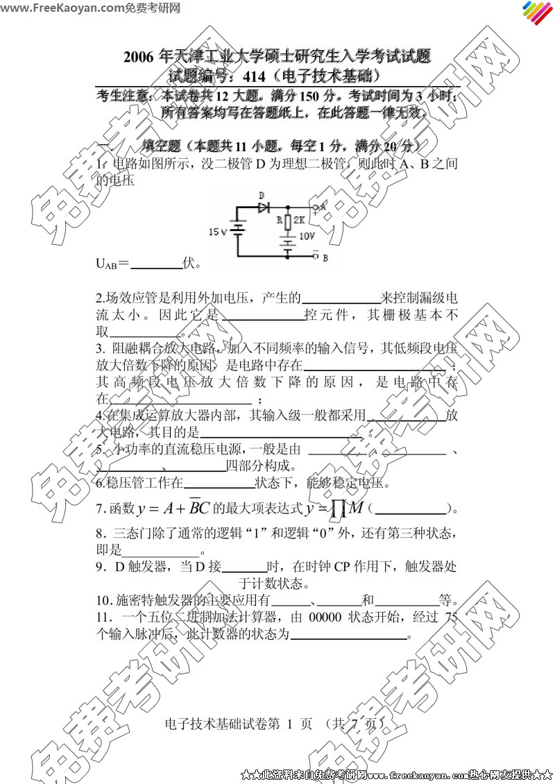 天津工业大学2006年半岛在线注册真题-电子技术基础(414)