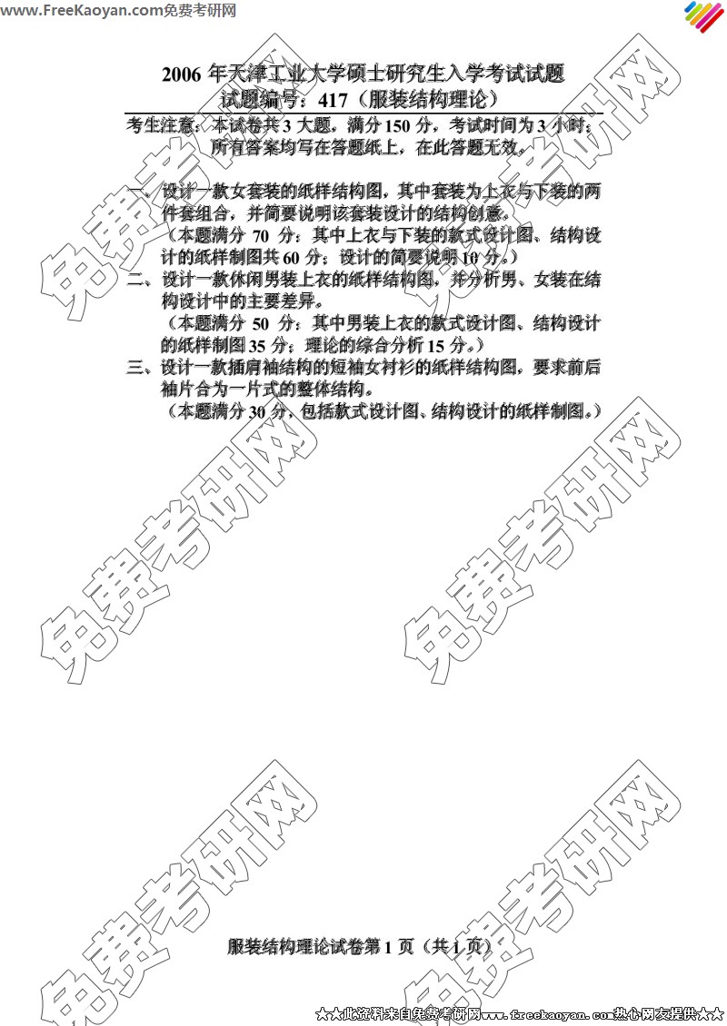 天津工业大学2006年半岛在线注册真题-服装结构理论(417)