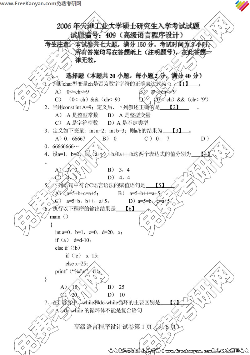 天津工业大学2006年半岛在线注册真题-高级语言程序设计(409)