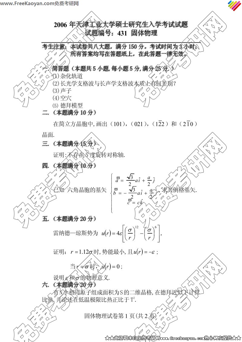 天津工业大学2006年半岛在线注册真题-固体物理(431)