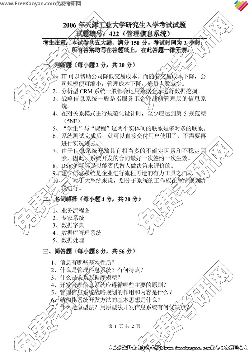 天津工业大学2006年半岛在线注册真题-管理信息系统(422)
