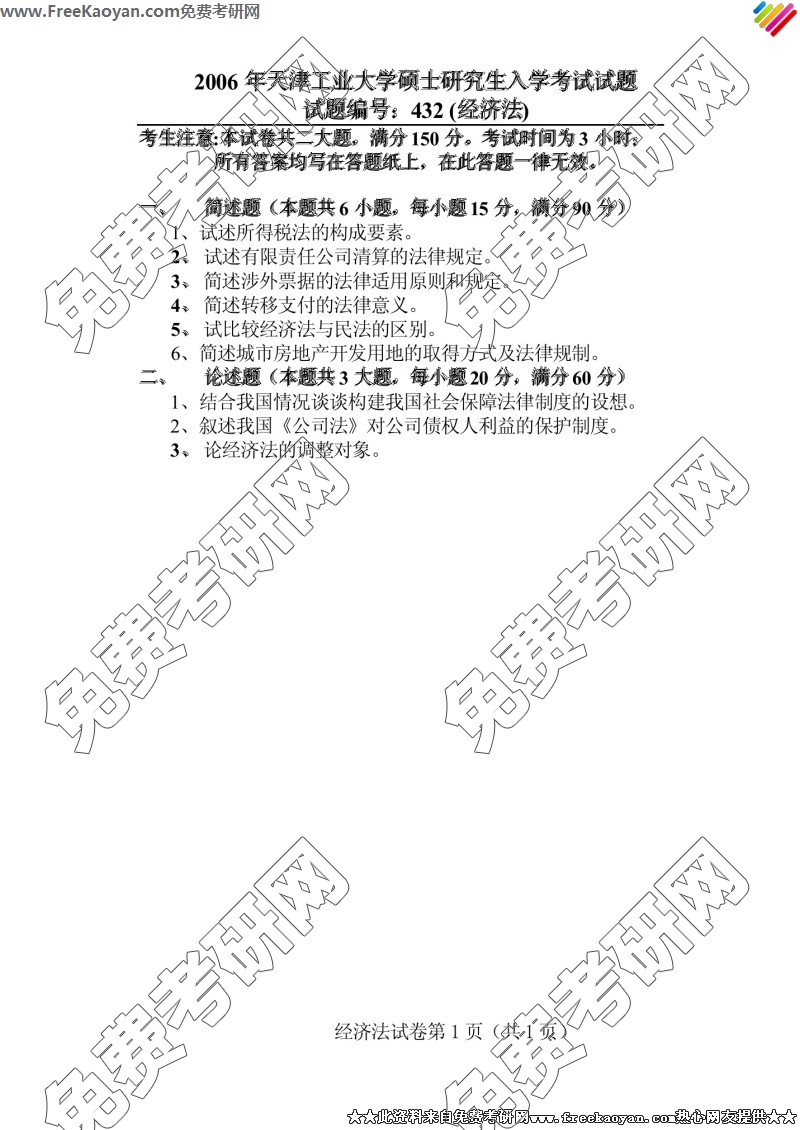 天津工业大学2006年半岛在线注册真题-经济法(432)