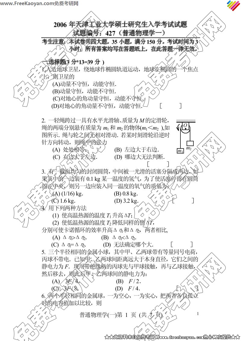 天津工业大学2006年半岛在线注册真题-普通物理学一(427)