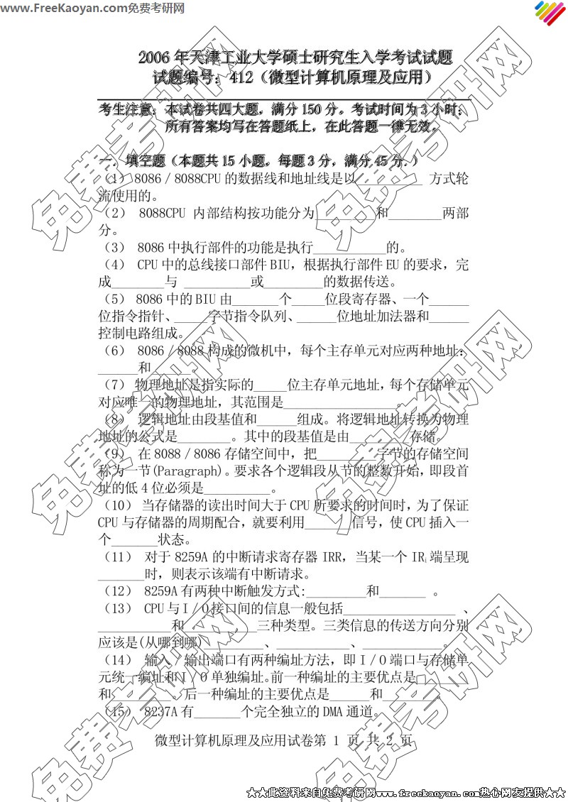 天津工业大学2006年半岛在线注册真题-微机原理(412)