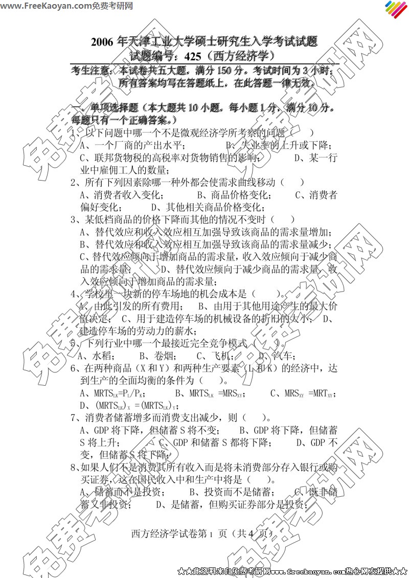 天津工业大学2006年半岛在线注册真题-西方经济学(425)