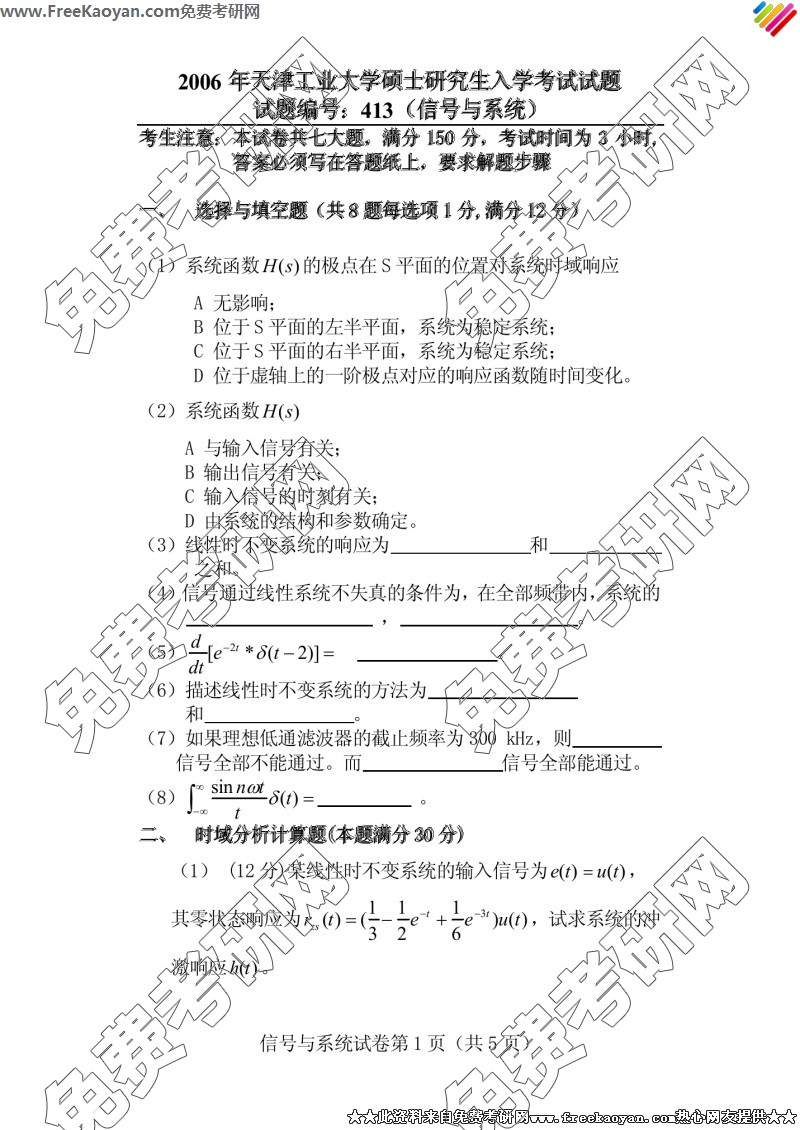 天津工业大学2006年半岛在线注册真题-信号与系统(413)