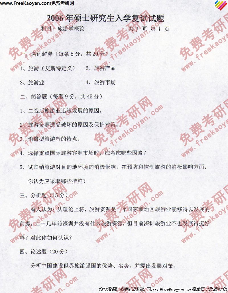 燕山大学2006年半岛在线注册真题-复试旅游学概论
