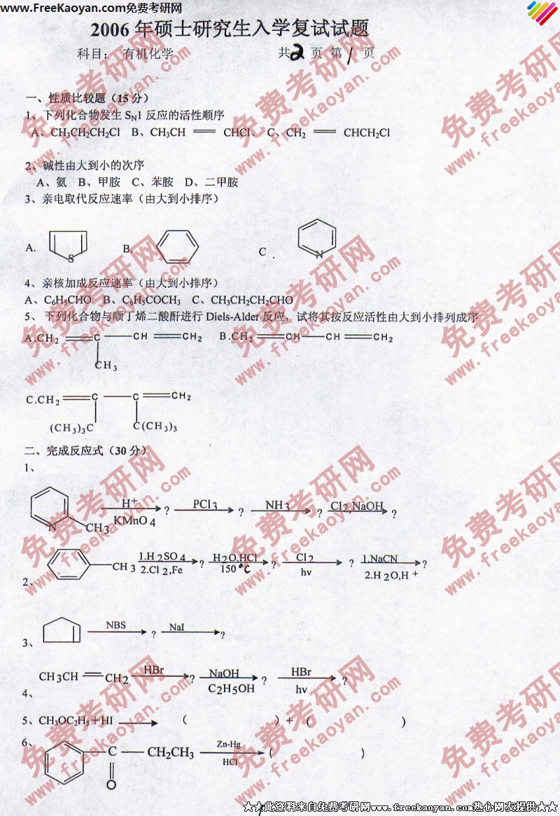 燕山大学2006年半岛在线注册真题-复试有机化学