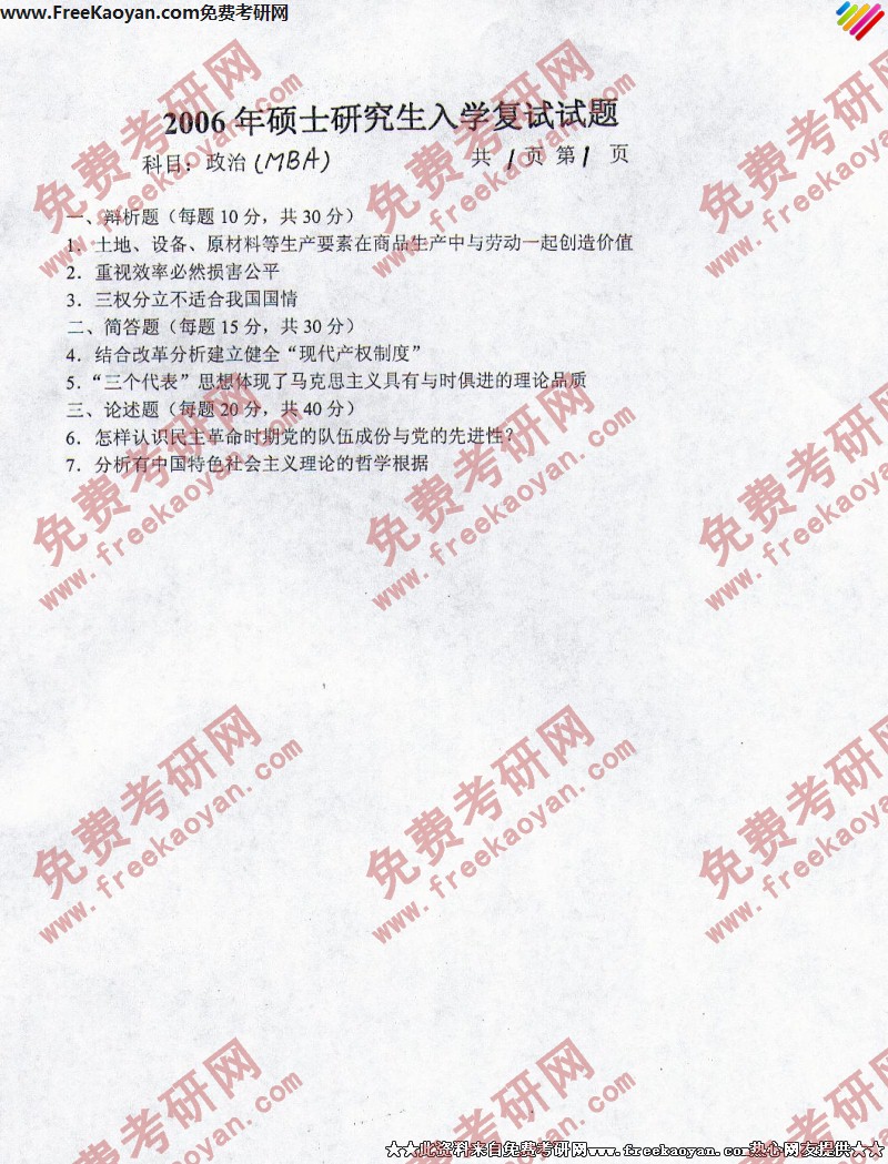 燕山大学2006年半岛在线注册真题-复试政治(MBA)