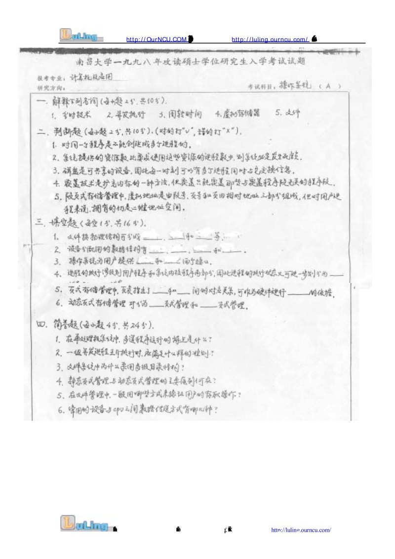 专业课半岛在线注册经验 本站小编 FreeKaoyan 2018-01-23南昌大学2002年攻读硕士学位研究生 入 学 考 试 试 题 报考专业:计算机应用 考试科目:操作系统(A)一. 简单解释下列名词或术语 (每小题2分共10分)1. 文件系统2. 与设备无关性3. 虚存4. 原语5. 作业控制方式二. 判断题(共10分,每题1分)1. 设计实时系统首先要考虑的是如何 ...