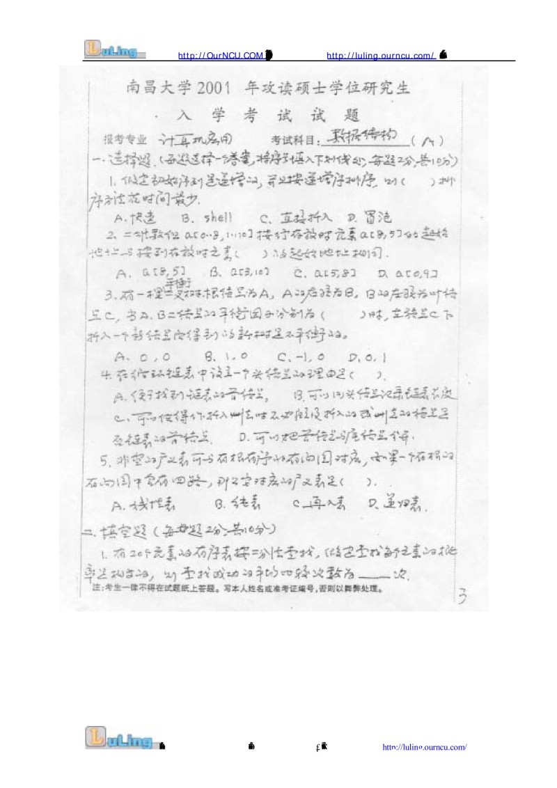 专业课半岛在线注册经验 本站小编 FreeKaoyan 2018-01-23南昌大学2003年攻读硕士学位研究生 入 学 考 试 试 题报考专业:计算机应用 考试科目:数据结构操作系统(A) 数据结构部分一. 单项选择题.(每题2分,共8分)1.对由n个记录组成的文件排序,如果n较小(n<50)且记录的规模较大,则采用( )排序方法节省时间. A.直接插入 B.直接选择 C ...