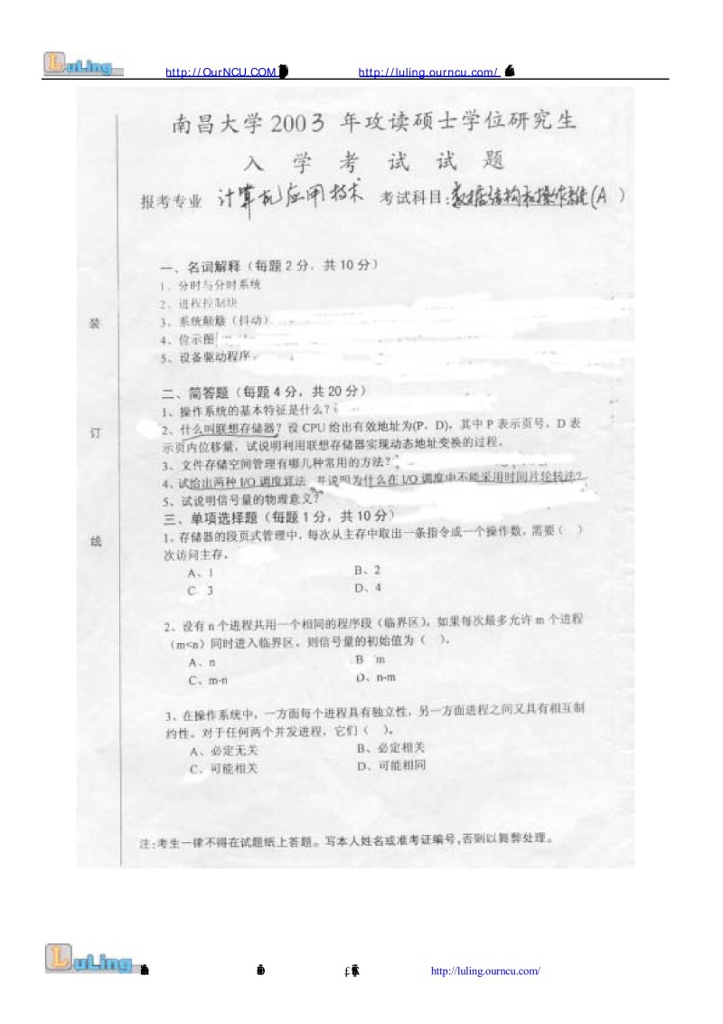 一名词解释3分/个) 病毒,模式种,单克隆抗体,化学需氧量,古细菌,Epitope,cell fusion,prophage,peptidoglycan,Intergration.二正确写出下列微生物的学名(2分/个)黄曲菌,炭疽芽孢杆菌,大肠埃希氏菌,伤寒沙门氏菌,痢疾志贺氏菌,酿酒酵母菌,粪链球 ...专业课半岛在线注册经验 本站小编 FreeKaoyan 2018-01-23南昌大学2003年半岛在线注册真题-数据结构操作系统A