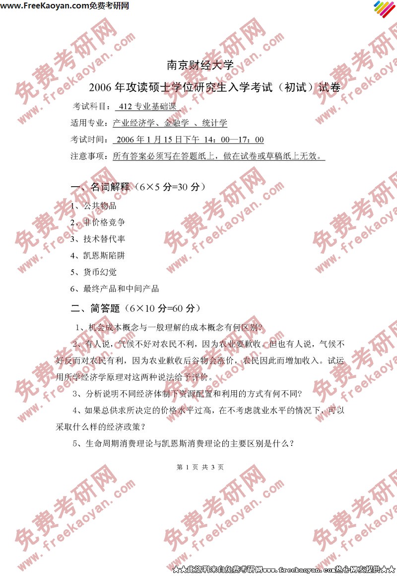 南京财经大学2006年半岛在线注册真题-专业基础课(产业经济学、金融学、统计学专业)