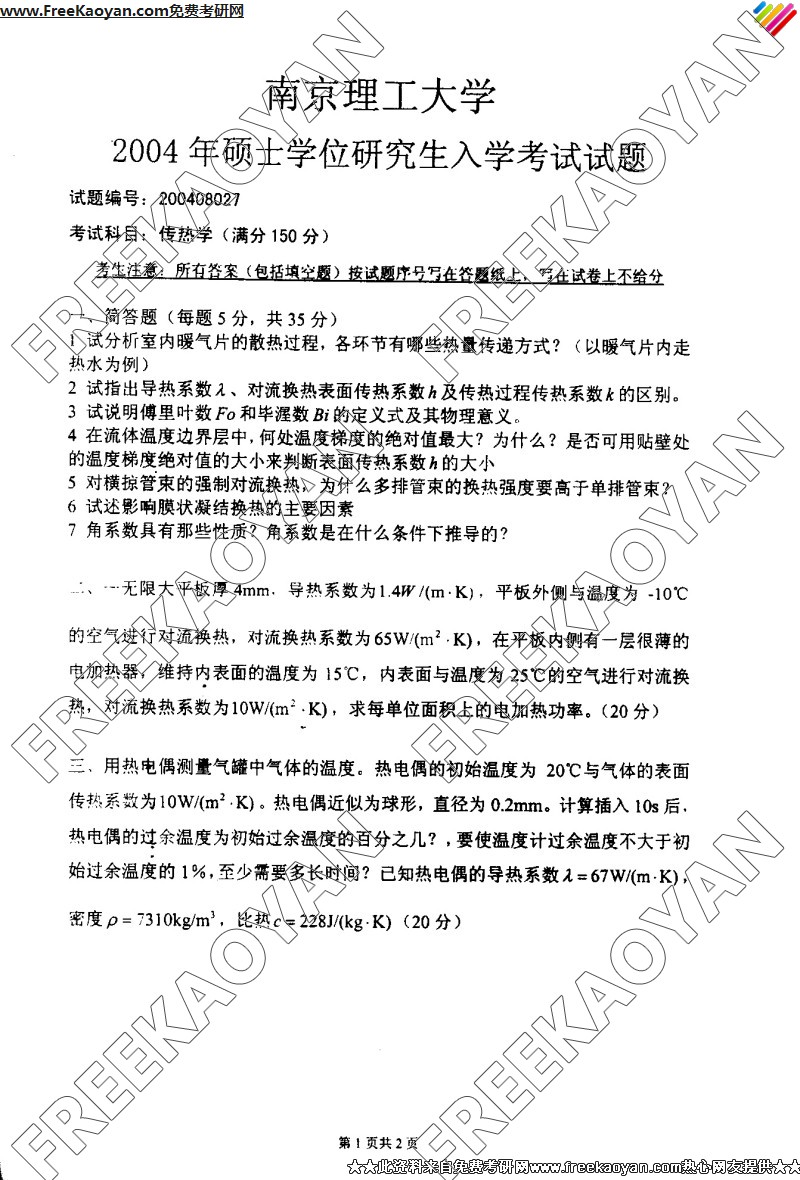南京理工大学2004年半岛在线注册真题-传热学