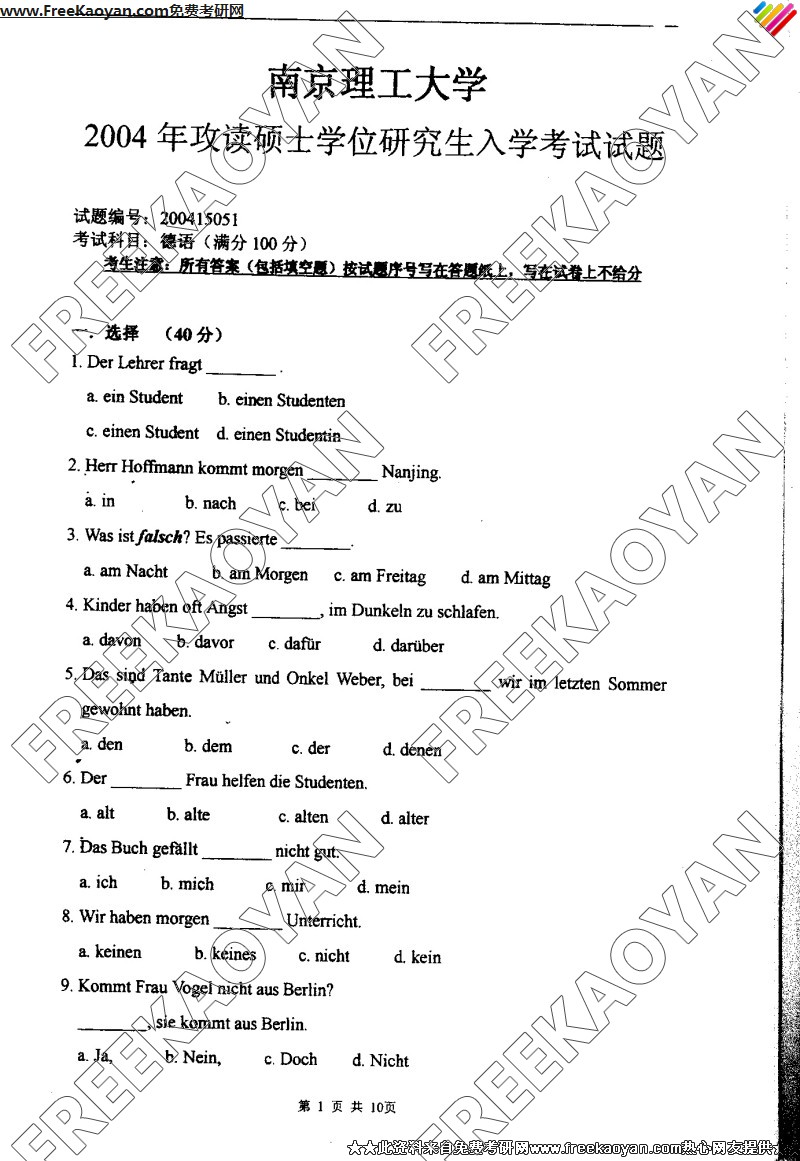南京理工大学2004年半岛在线注册真题-德语