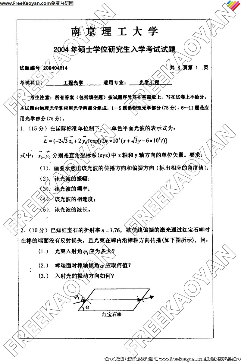 南京理工大学2004年半岛在线注册真题-工程光学