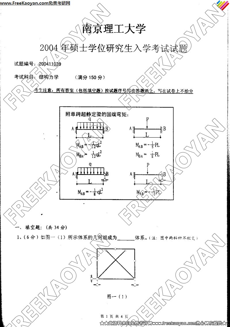 专业课半岛在线注册经验 本站小编 FreeKaoyan 2018-01-23南京理工大学2004年半岛在线注册真题-工程力学(B)