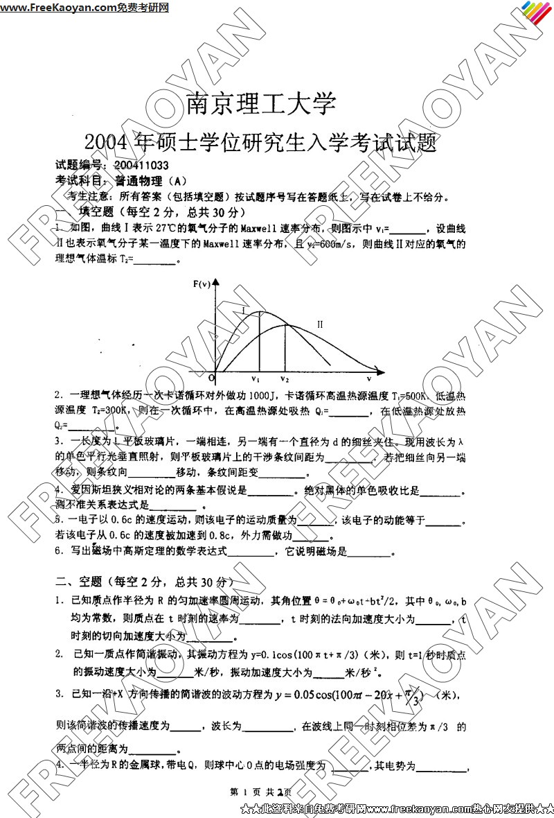 南京理工大学2004年半岛在线注册真题-普通物理(A)