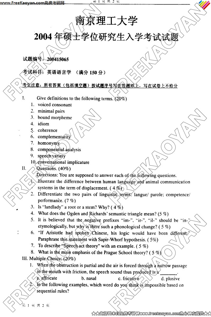南京理工大学2004年半岛在线注册真题-英语语言学