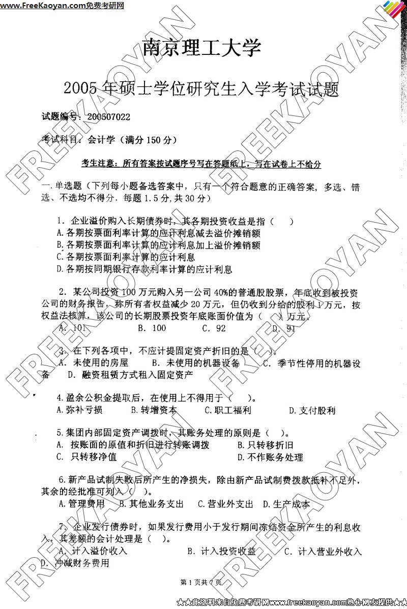 南京理工大学2005年半岛在线注册真题-会计学
