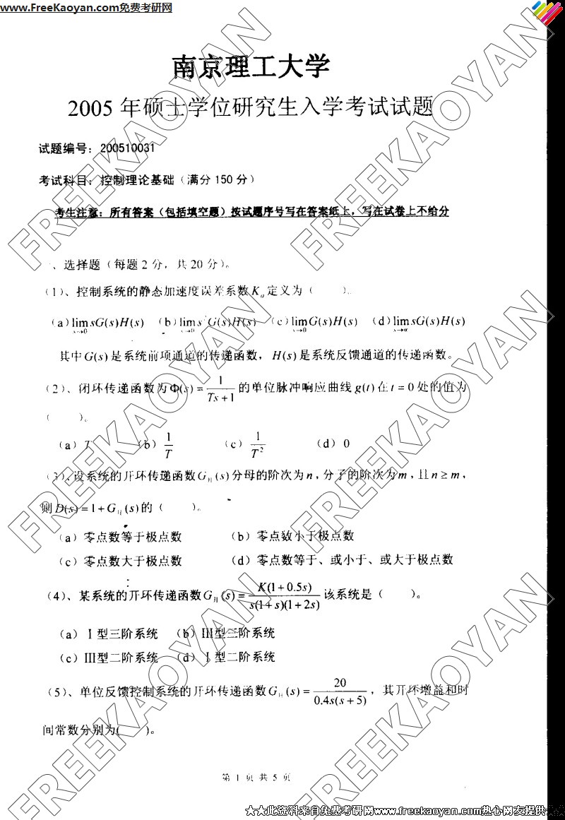 南京理工大学2005年半岛在线注册真题-控制理论基础