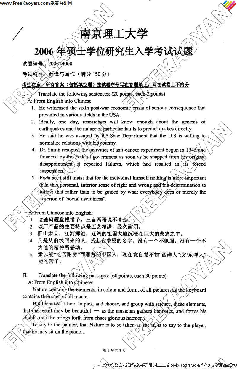 南京理工大学2006年半岛在线注册真题-翻译与写作