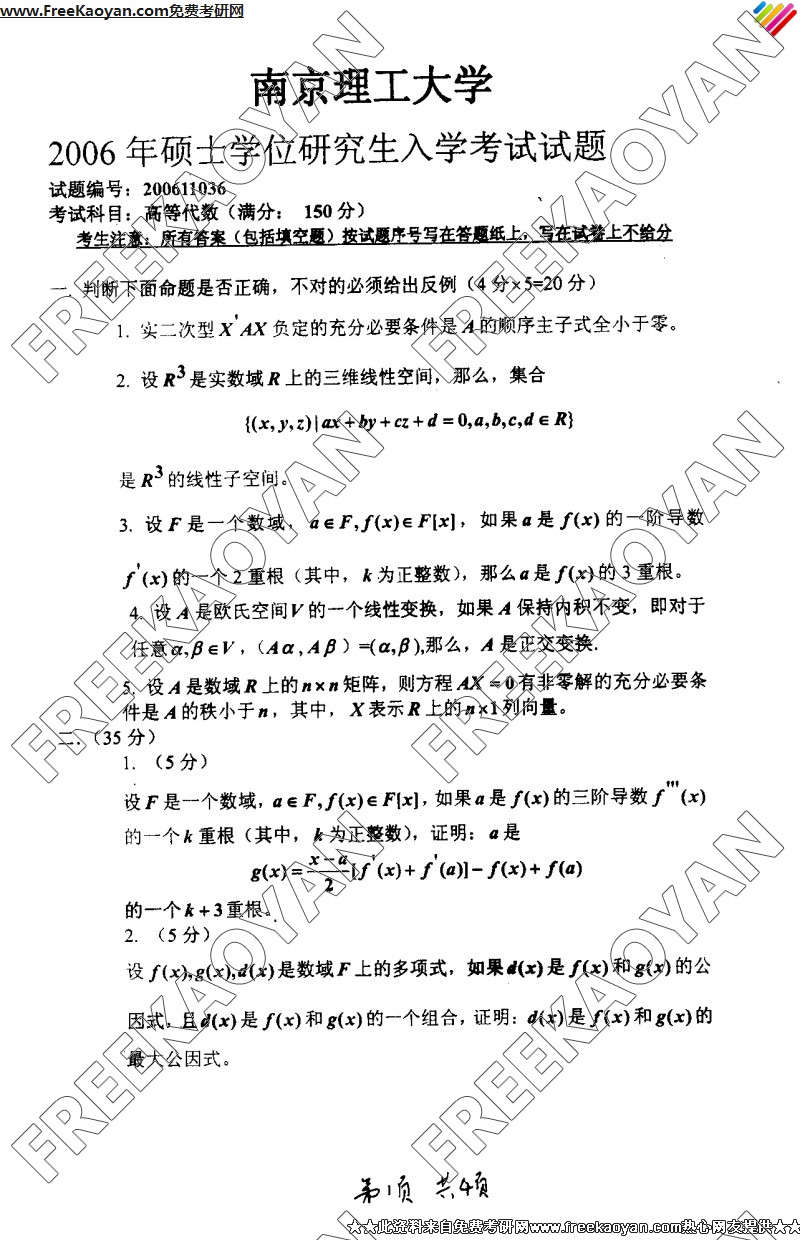 南京理工大学2006年半岛在线注册真题-高等代数