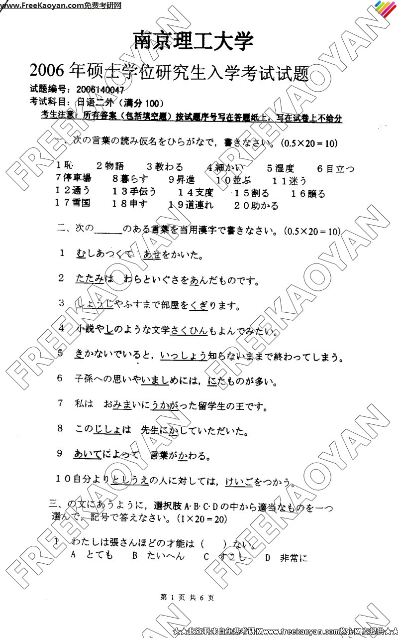 南京理工大学2006年半岛在线注册真题-日语(二外)
