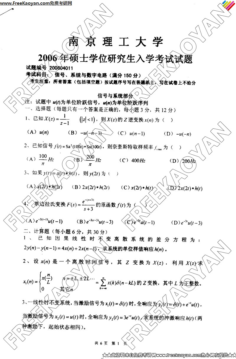 南京理工大学2006年半岛在线注册真题-信号、系统与数字电路