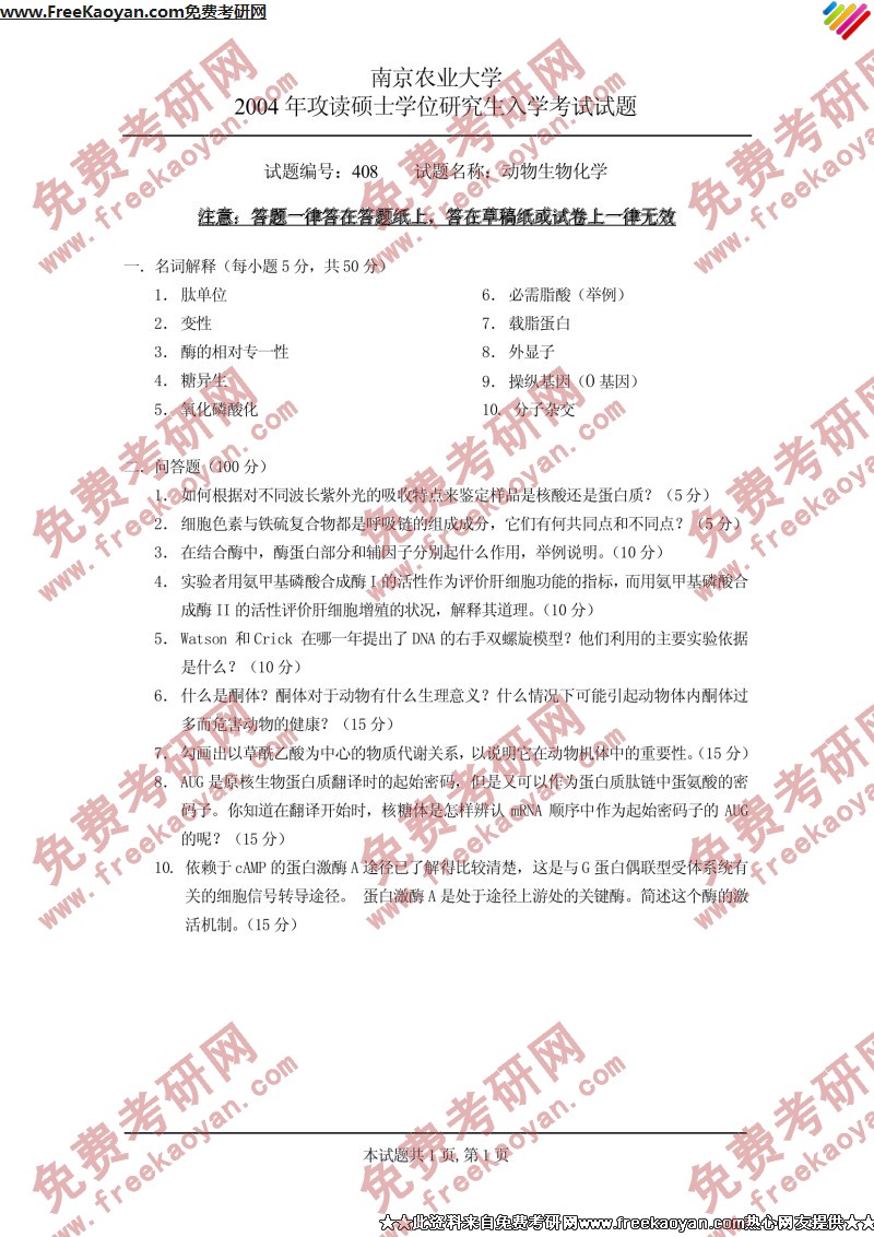 南京农业大学2004年半岛在线注册真题-动物生物化学