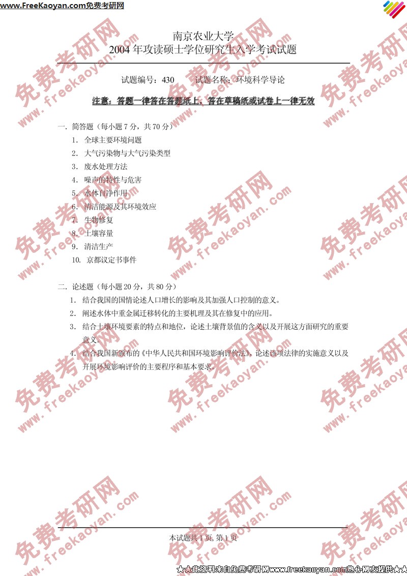 专业课半岛在线注册经验 本站小编 FreeKaoyan 2018-01-23南京农业大学2004年半岛在线注册真题-环境化学