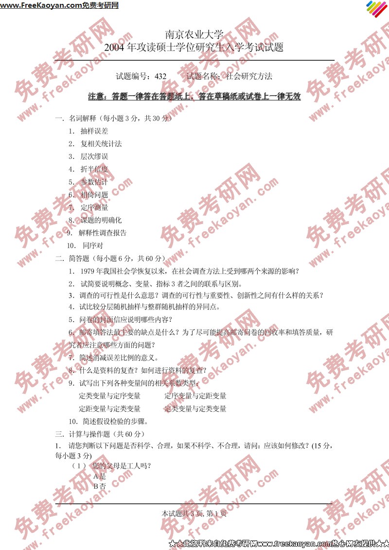 南京农业大学2004年半岛在线注册真题-社会研究方法