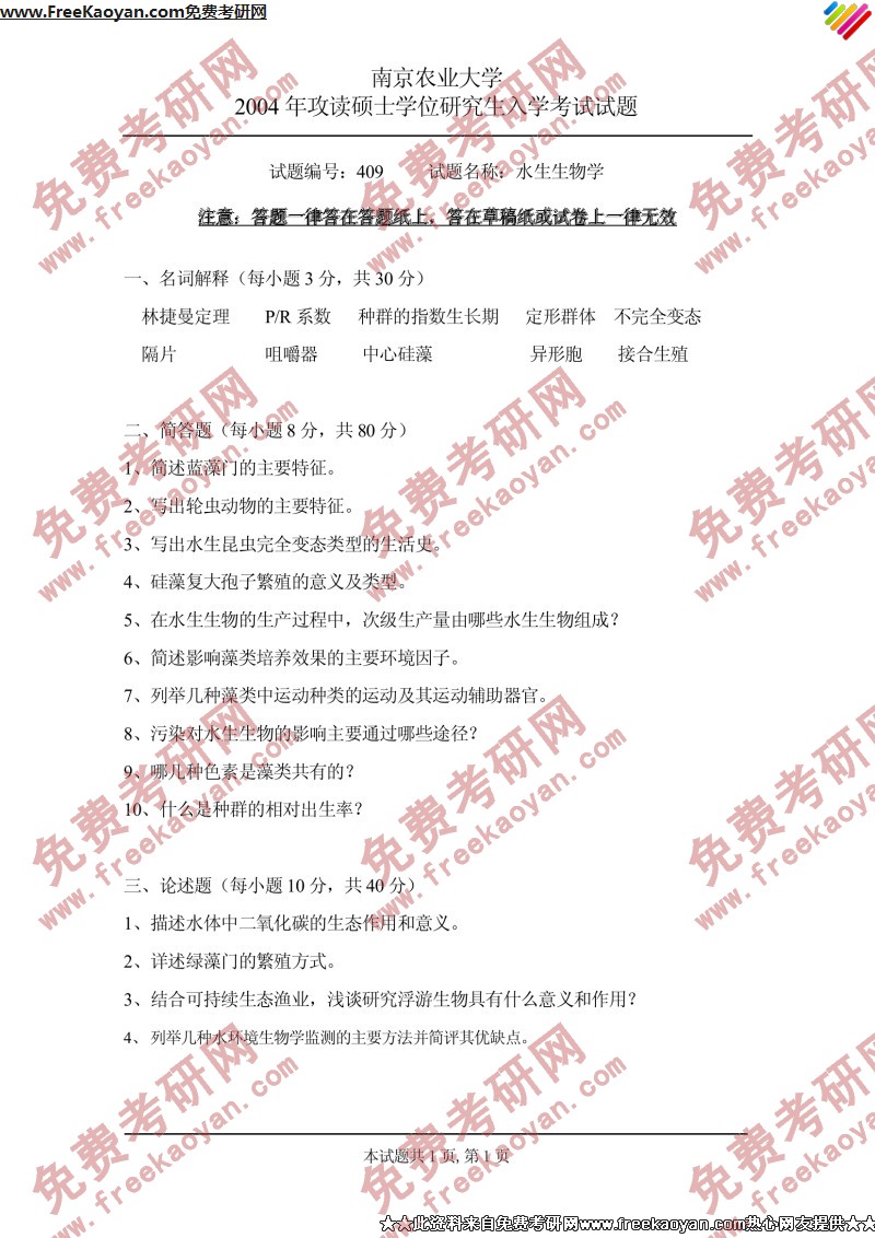 南京农业大学2004年半岛在线注册真题-水生生物学