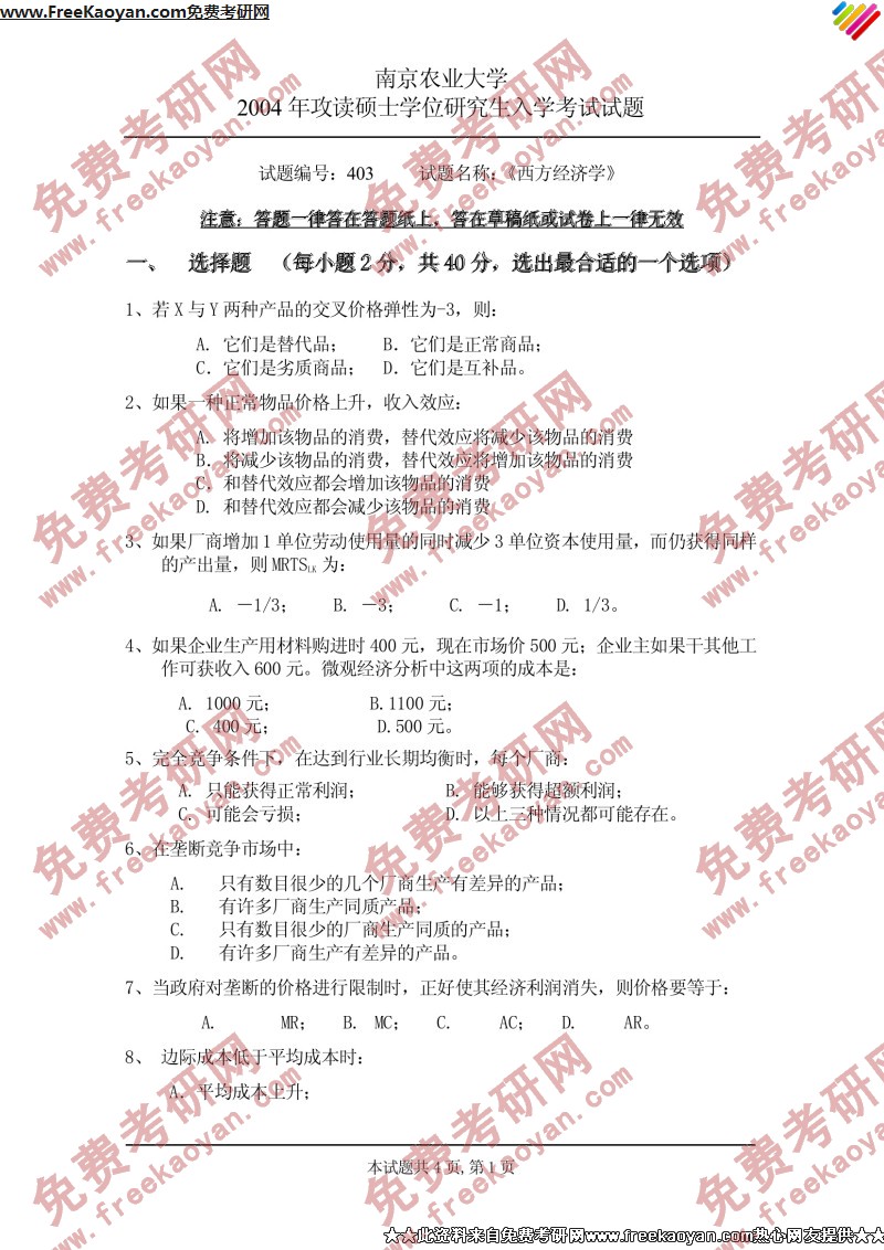 南京农业大学2004年半岛在线注册真题-西方经济学