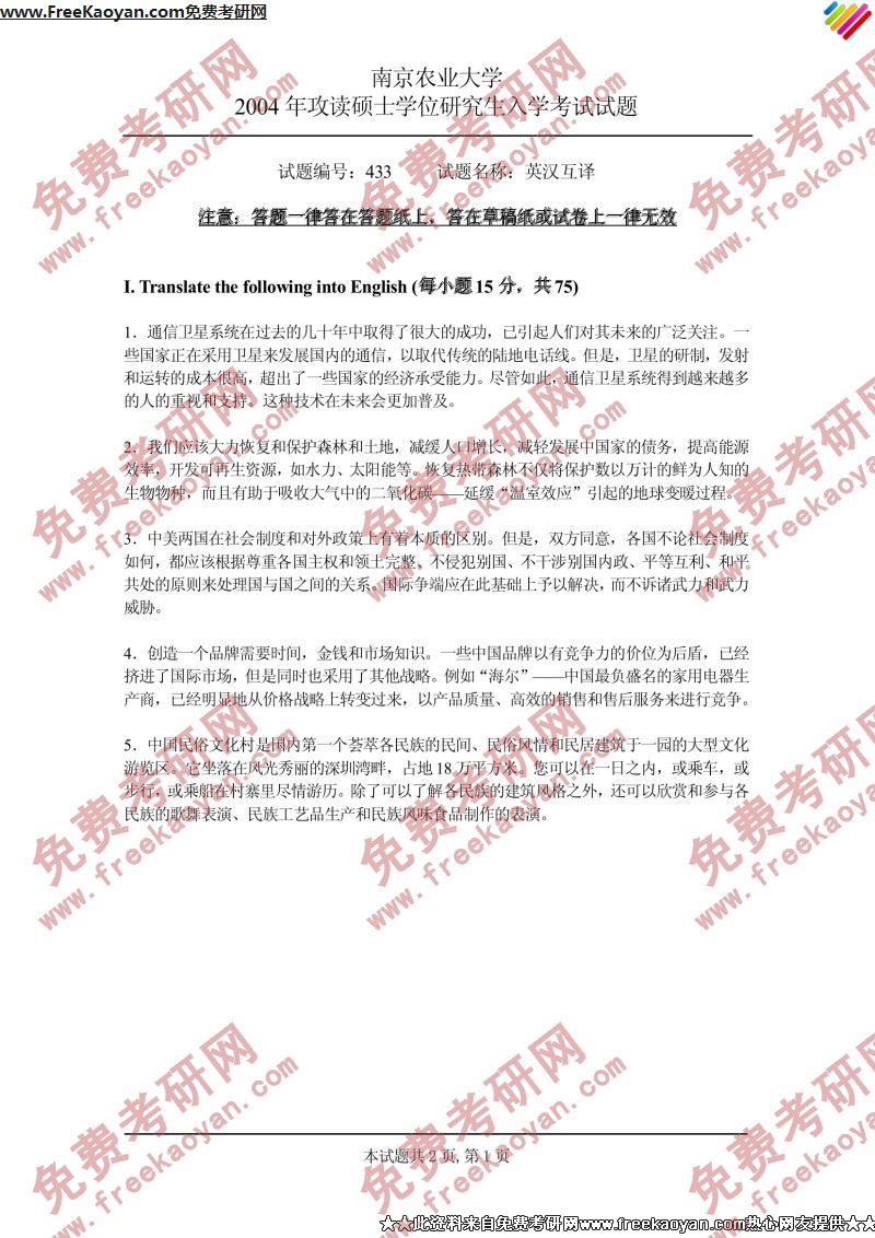 南京农业大学2004年半岛在线注册真题-英汉互译