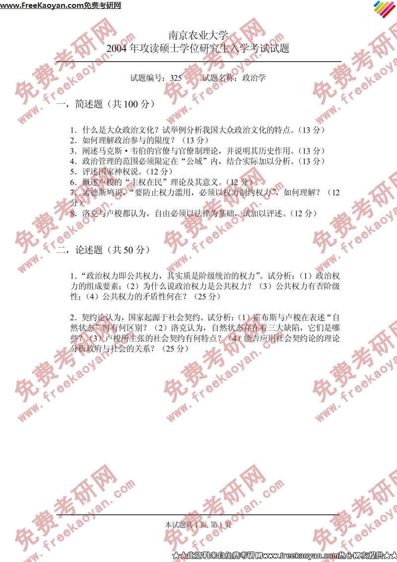 南京农业大学2004年半岛在线注册真题-政治(单)